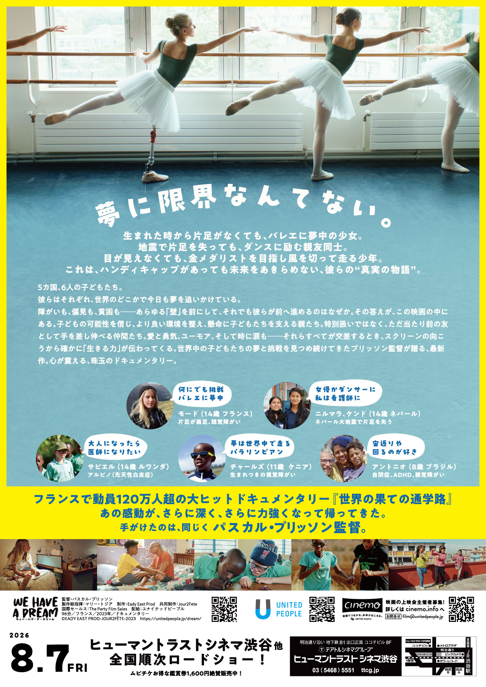 5カ国、6人の子どもたち。彼らはそれぞれ、世界のどこかで今日も夢を追いかけている。障がいも、偏見も、貧困も ── あらゆる「壁」を前にして、それでも彼らが前へ進めるのはなぜか。その答えが、この映画の中にある。子どもの可能性を信じ、より良い環境を整え、懸命に子どもたちの未来を拓こうとする親たち。特別扱いではなく、ただ当たり前の友として手を差し伸べる仲間たち。愛と勇気、ユーモア、そして時に涙──それらすべてが交差するとき、スクリーンの向こうから確かに「生きる力」が伝わってくる。世界中の子どもたちの夢と挑戦を見つめ続けてきたプリッソン監督が贈る、最新作。心が震える、珠玉のドキュメンタリー。