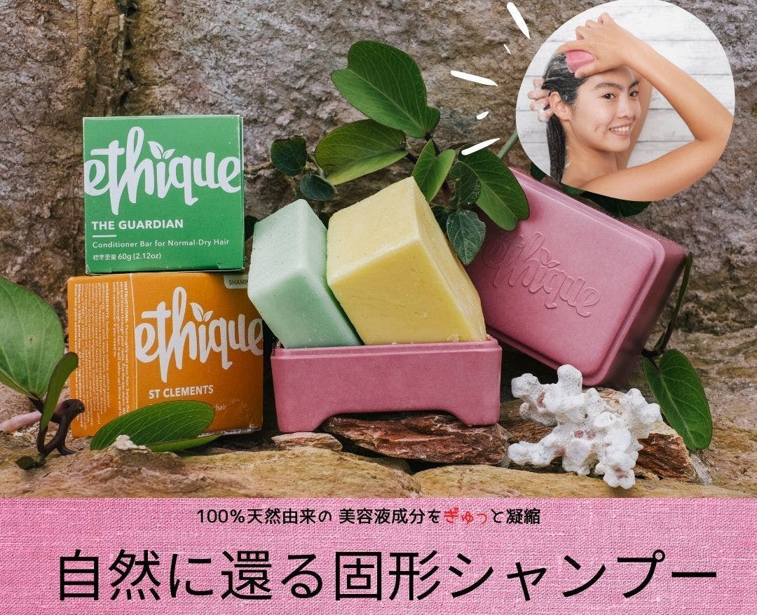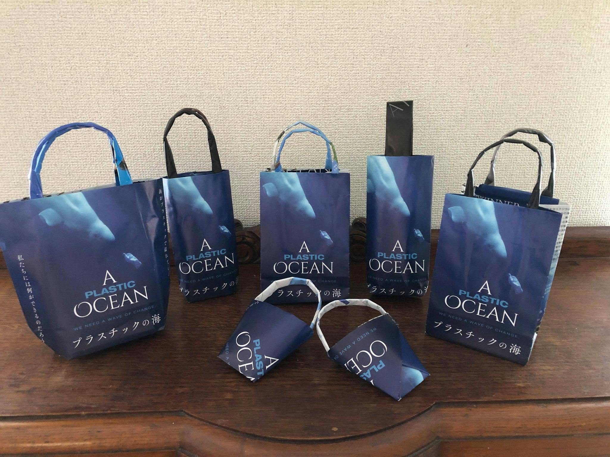 『プラスチックの海』のポスターで作成したポスターバック(サイズは選べません)と、エシカルオーガニック&ナチュラル(オーガニック認証の基準をクリア)なライフスタイルを提案するブランドのセレクトショップ エシカミ― で販売中のニュージーランド発のサスティナブル ビューティーバーブランド「エティーク」のシャンプーバー、コンディショニングバーのサンプルセット。