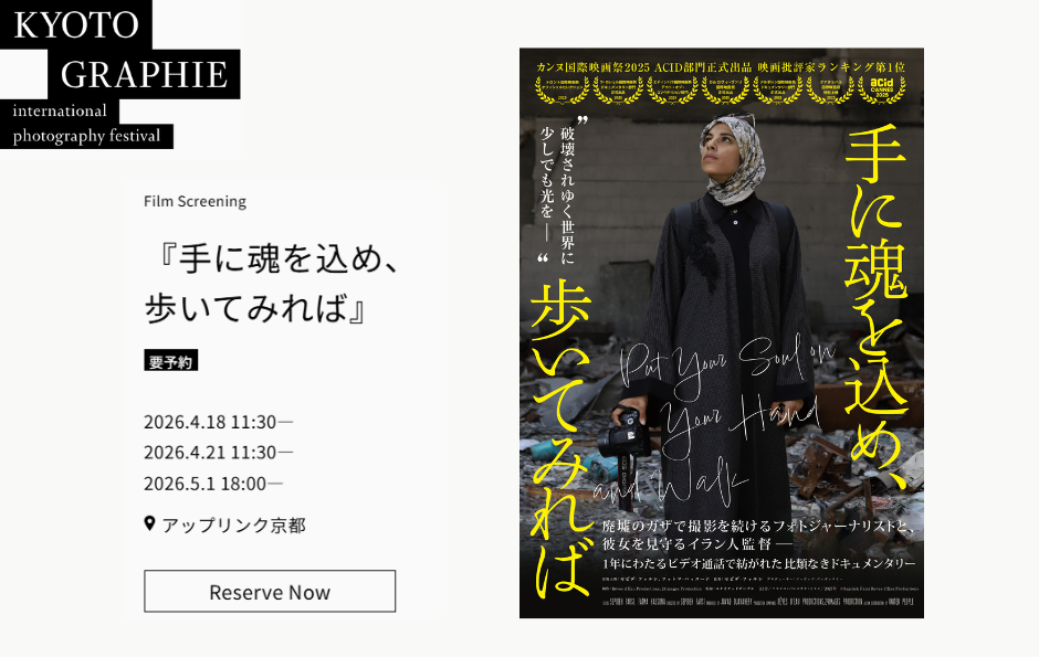 また、KYOTOGRAPHIE 2026 開催記念として、映画『手に魂を込め、歩いてみれば』がアップリンク京都で上映されます。ぜひお誘い合わせのうえご来場いただけますと幸いです。