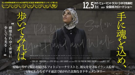 『手に魂を込め、歩いてみれば』が12月5日(金)ヒューマントラストシネマ渋谷ほか全国順次ロードショー! 廃墟のガザで撮影を続けるフォトジャーナリストと、彼女を見守るイラン人監督── 1年にわたるビデオ通話で紡がれた比類な … 続きを読む 団体向けチケット販売開始 映画『手に魂を込め、歩いてみれば』
